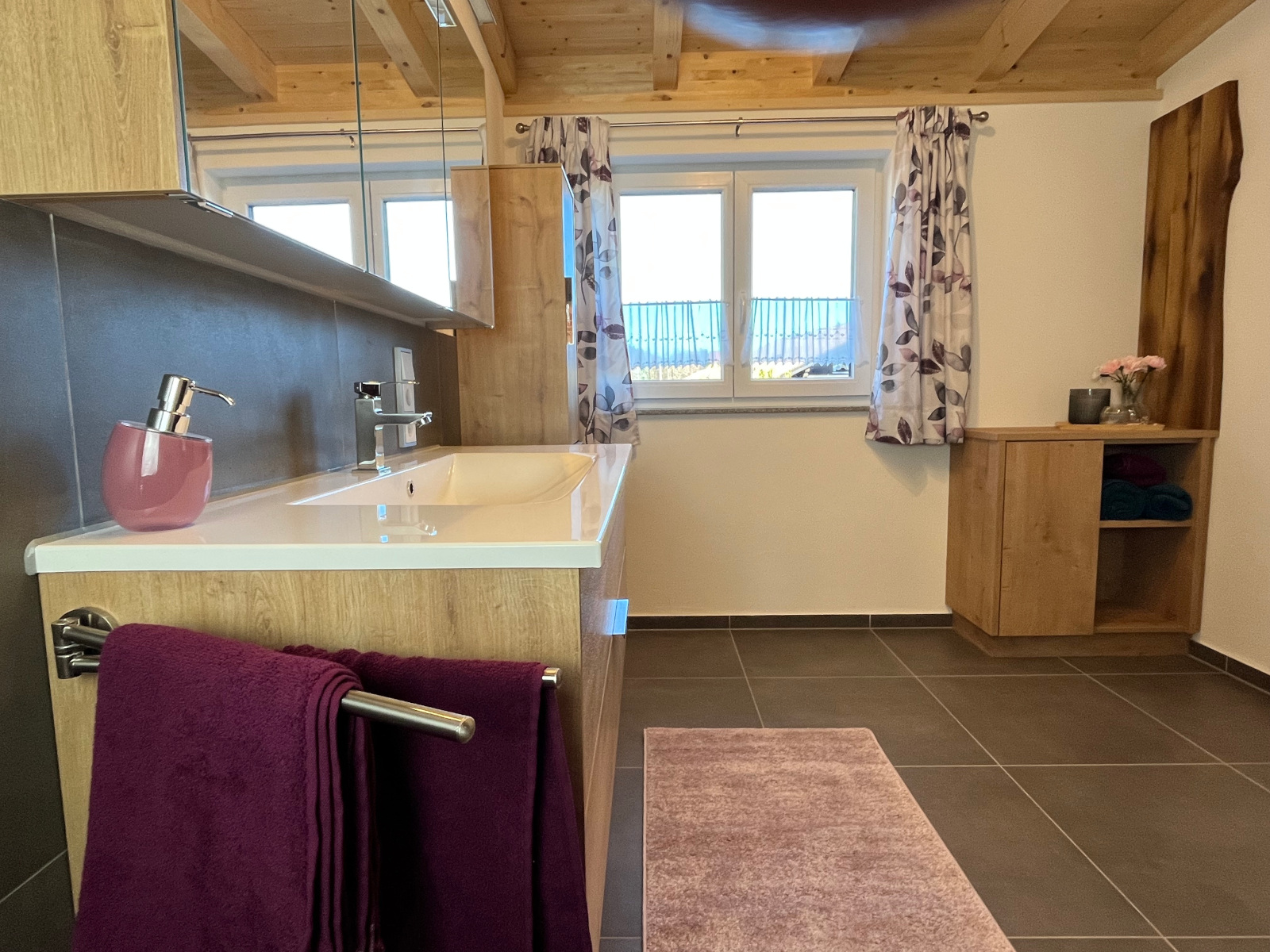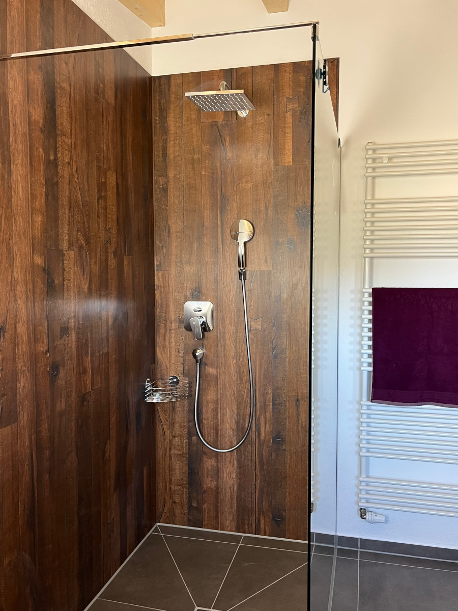 Das komfortable Badezimmer ist ebenerdig und ist mit Regendusche, zusätzlicher Handbrause, Fön, Handtüchern, Badetüchern und Vorleger ausgestattet.